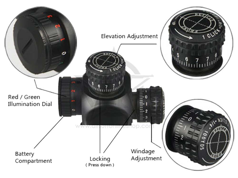 2.5-10X26 rifle scope Magnification : 2.5X - 10X 1 Click = : 1/4" Reticle : red / green illuminated Length : 290mm Net Weight : 523g