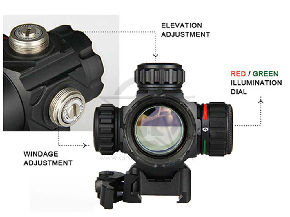 Magnification: 1X Objective Diameter: 26mm Parallax Setting: Infinity Field of View @ 100 yards:70 Eye Relief: Flexible Exit Pupil: 22mm Click Value @ 100 yards: 1/2" Tube Diameter: 30mm Length: 99.5mm Weight: 5.6oz