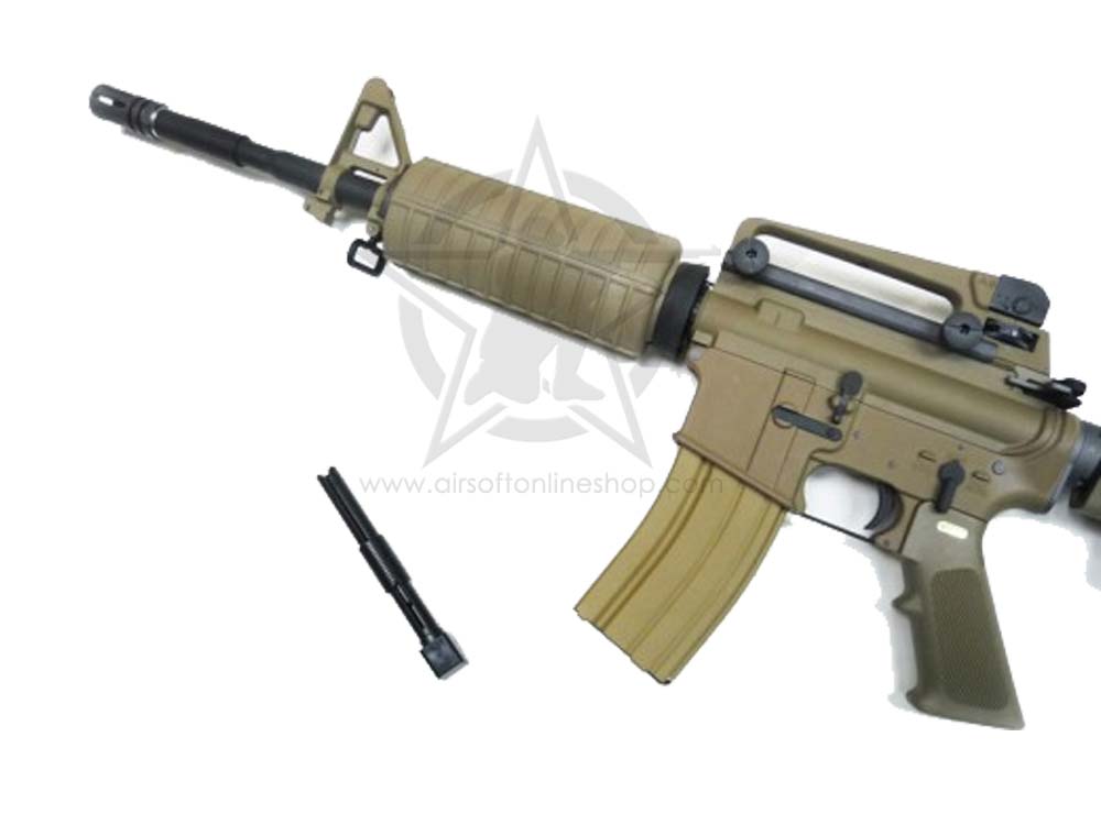 Features: 14mm”-” Steel made Flash Hider. Nylon Fiber Hand guard with 14.5 inch outer barrel. The outer barrel can switch into 10.5 inch by removing the extended barrel assembry. User also can replace with shorter inner barrel for making their own CQB mod. The front hand guard can store up to 9.6V small type battery (small type). Comes with metal frame with no marking and comes with a removable carrying handle. Standard 20mm rail on the upper frame for rail attachments. Constructed of WE Custom Ver 2 8mm Metal Bushing Gear Box. Spring release function when user switch the selector to “Safe”. Adjustable Hopup system and inner barrel are compatible with TM M4 AEG standard. Bolt catch function available for easy Hopup adjustment. Comes with a Nylon Fiber made Expandable Stock. Ready to go for 390 – 410 FPS without modification. Included 430 rounds M4 Hi-cap Magazine. Compatible with most of the TM M4 style magazines in the market.