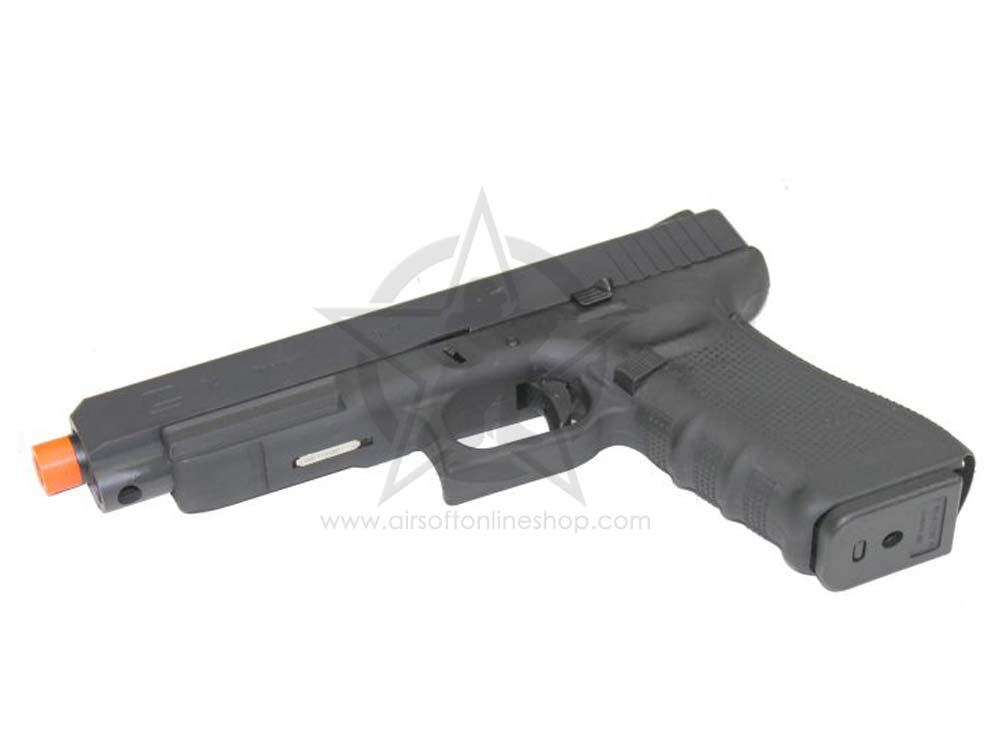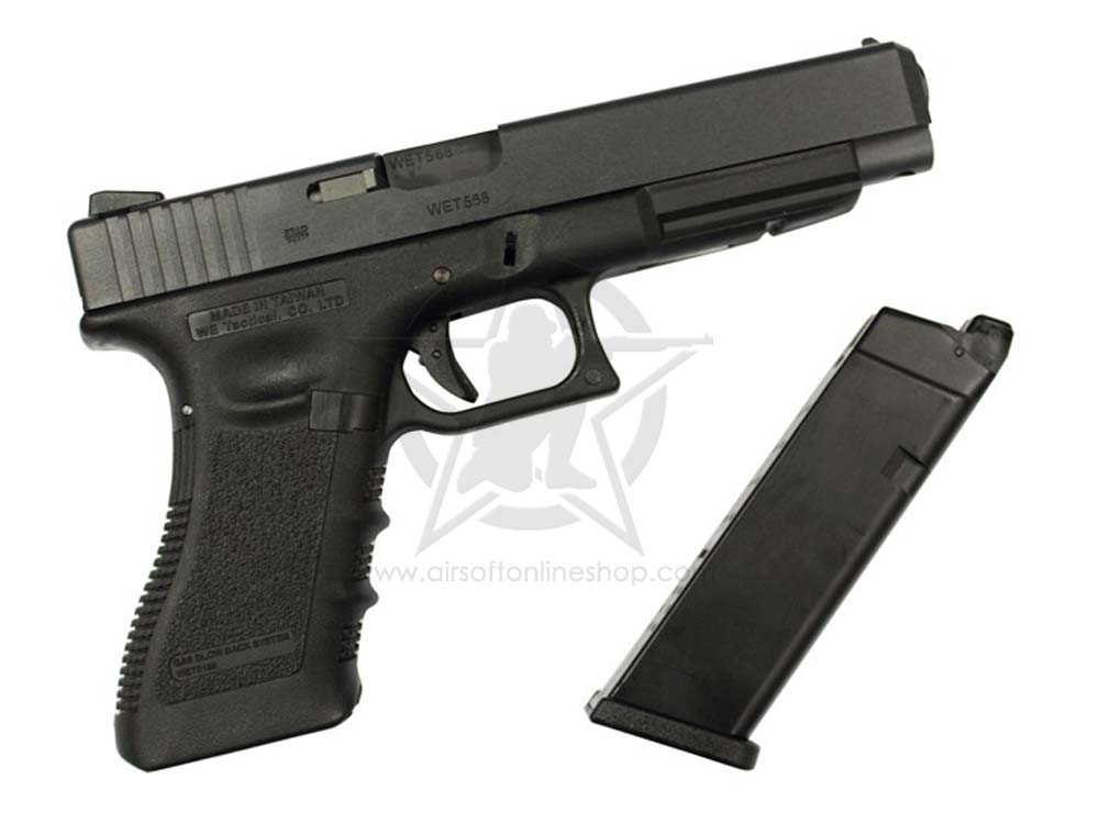 Features: Metal Slide with “G34 Tactical” marking, discrete ejector and outer barrel. Fixed front sight with white dots on the outer barrel and tactical rear sight with white dot. Polymer Lower Frame with “WE” marking and comes with an extended slide stop. Realistic trigger function same as real steel. Adjustable Hop-up system. Included 25 rounds G17 Magazine. Compatible with WE 50rds Glock long mag and TM / Stark Arms G17/18 25 rds and 50rds long mag.